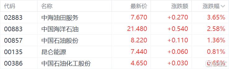 石油股普遍上扬,中海油田服务涨超3%,中国海洋石油涨超2%,中国石油股份涨超1%。