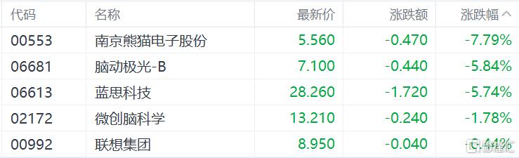 脑机接口概念股跌幅居前,南京熊猫电子股份跌7.79%,脑动极光-B跌5.84%,微创脑科学跌1.78%。