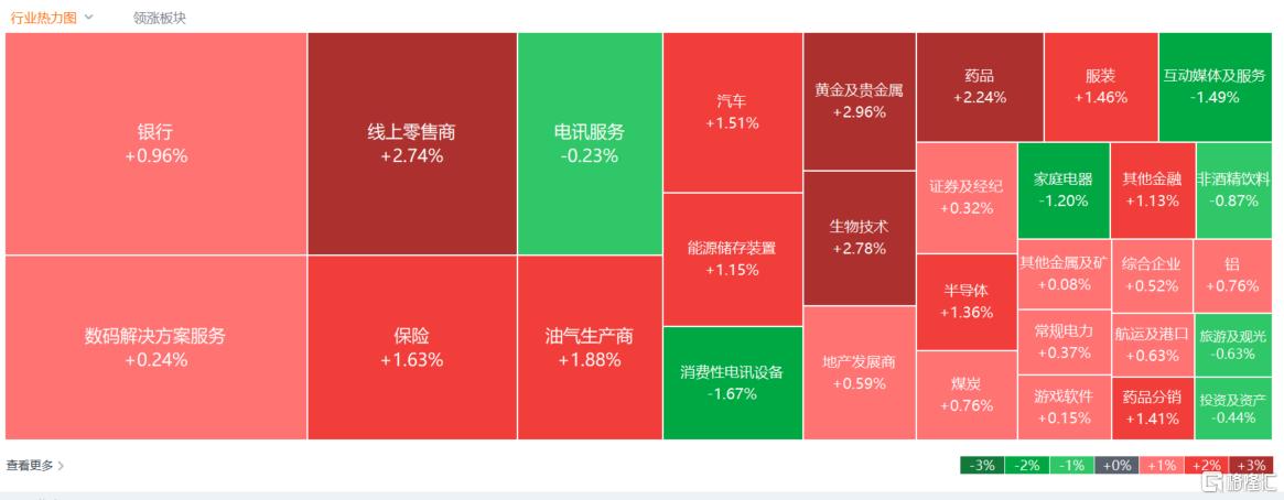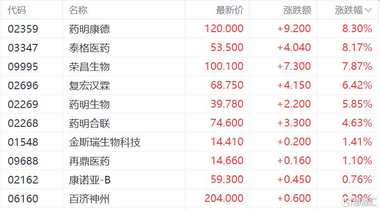 生物医药股上涨,药明康德、泰格医药涨超8%,荣昌生物涨超7%,复宏汉霖涨超6%,药明生物、药明合联、金斯瑞生物科技、再鼎医药跟涨。