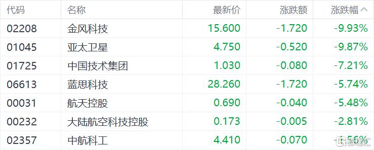 商业航天股集体回撤,亚太卫星跌超9%,中国技术集团跌超7%,航天控股跌超5%。