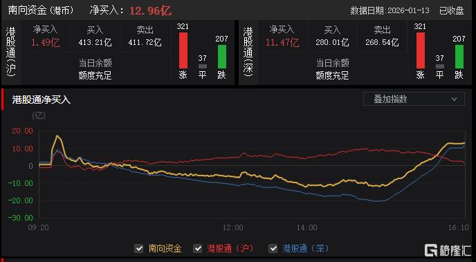 南向资金净买入12.96亿港元,其中港股通(沪)净买入1.49亿港元,港股通(深)净11.47亿港元。