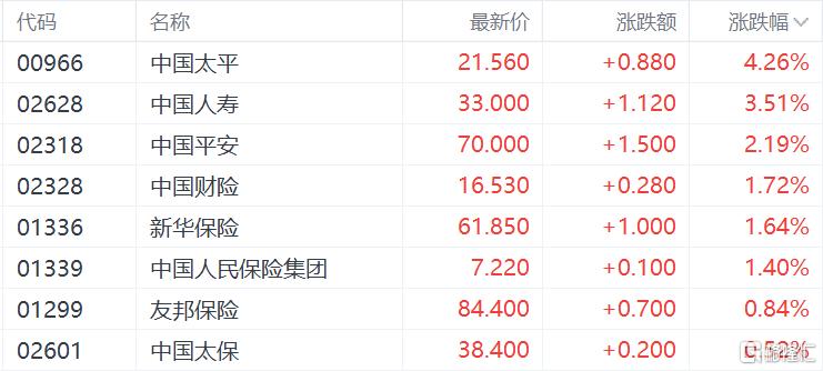 保险股表现活跃,中国太平涨超4%,中国人寿涨超3%,中国平安、中国财险、新华保险跟涨。