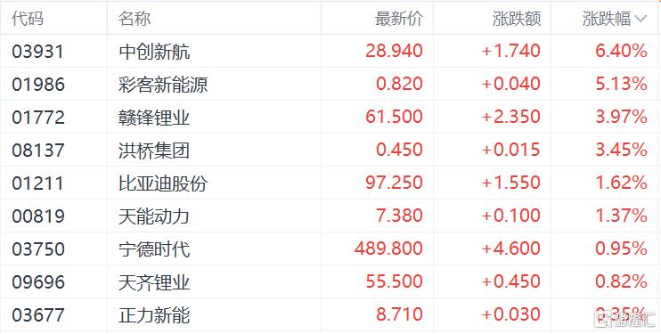 锂电池股大幅拉升,中创新航涨6.4%,赣锋锂业、洪桥集团涨超3%,天齐锂业、天能动力、宁德时代跟涨。