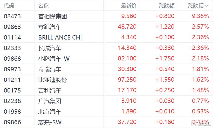 汽车股普涨,零跑汽车、长城汽车、小鹏汽车涨超2%,奇瑞汽车、比亚迪股份、吉利汽车涨超1%。