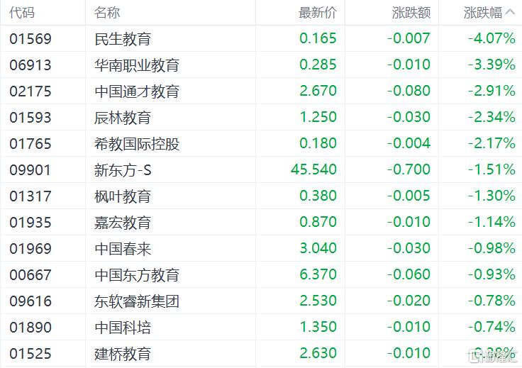 内地教育股普跌,民生教育跌超4%,华南职业教育跌超3%,中国通才教育、辰林教育、希教国际控股跌超2%,枫叶教育、嘉宏教育、中国春来、建桥教育纷纷下跌。