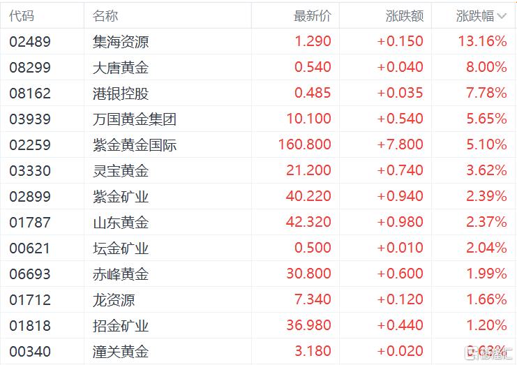 黄金及贵金属板块上涨,集海资源涨超13%,大唐黄金涨8%,万国黄金集团、紫金黄金国际涨超5%,灵宝黄金、紫金矿业山东黄金赤峰黄金跟涨。