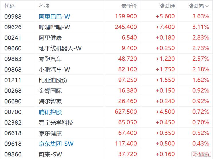 科网股部分上涨,阿里巴巴、哔哩哔哩涨超3%,京东涨0.43%;快手跌2.2%,小米、百度跌近2%。