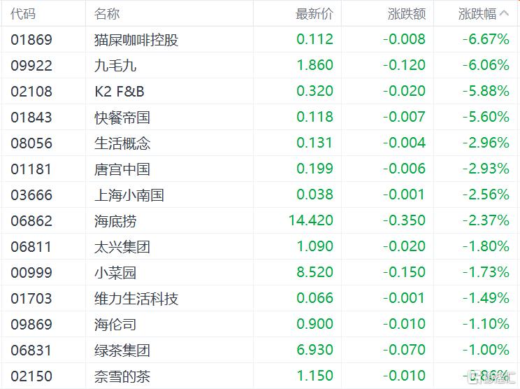 餐饮股下挫,九毛九跌超6%,唐宫中国、海底捞跌超2%,小菜园、海伦司、绿茶集团、奈雪的茶跟跌。